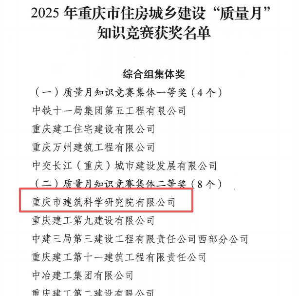 近日,重慶設(shè)計(jì)集團(tuán)所屬子企業(yè)重慶市建筑科學(xué)研究院有限公司(以下簡(jiǎn)稱“市建科院”)在參加重慶市住房和城鄉(xiāng)建設(shè)工程質(zhì)量安全總站、重慶市建設(shè)工程質(zhì)量協(xié)會(huì)組織開展的2025年重慶市住房城鄉(xiāng)建設(shè)“質(zhì)量月”知識(shí)競(jìng)賽中,榮膺3項(xiàng)集體獎(jiǎng)、8項(xiàng)個(gè)人獎(jiǎng)。