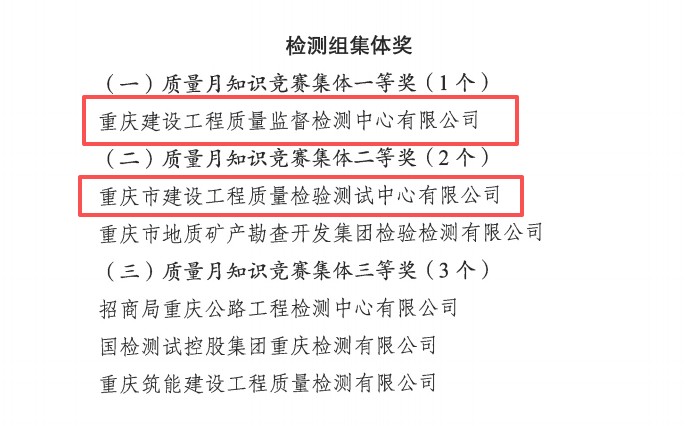 市建科院所屬重慶建設(shè)工程質(zhì)量監(jiān)督檢測(cè)中心有限公司、重慶市建設(shè)工程質(zhì)量檢驗(yàn)測(cè)試中心有限公司在檢測(cè)組比賽中表現(xiàn)突出,分別摘得檢測(cè)組集體獎(jiǎng)一等獎(jiǎng)和檢測(cè)組集體獎(jiǎng)二等獎(jiǎng)。