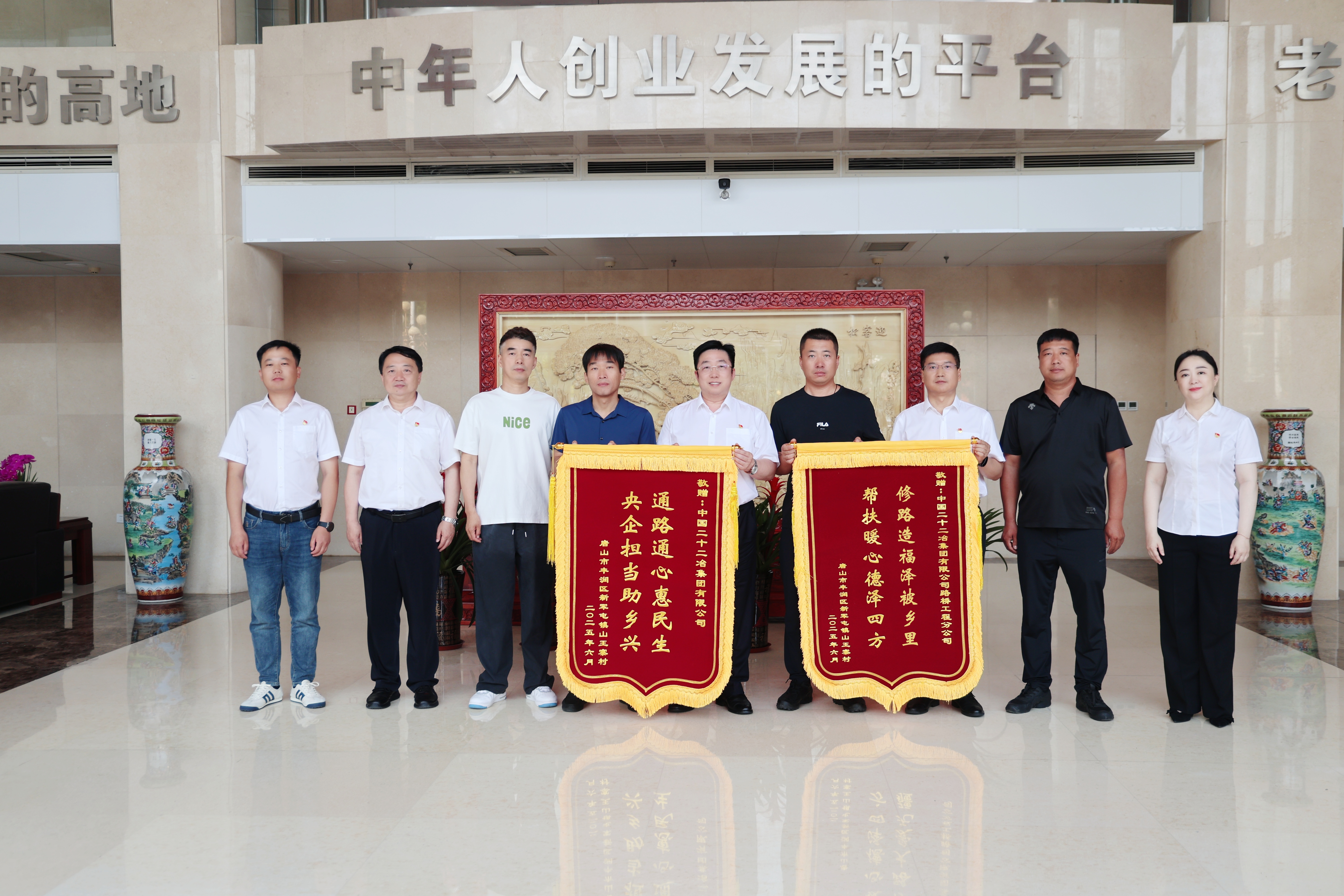 6月18日,唐山市總工會(huì)副主席付競(jìng)楠一行來到中國二十二冶辦公大樓,將寫著“通路通心惠民生 央企擔(dān)當(dāng)助鄉(xiāng)興”和“修路造福澤被鄉(xiāng)里 幫扶暖心德澤四方”的兩面錦旗送到了公司領(lǐng)導(dǎo)手中,表達(dá)對(duì)中國二十二冶路橋分公司傾力幫扶的深深謝意。